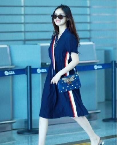 深蓝色连衣裙是十分居家的款式,尤其是轻薄的棉质面料,贴肤舒适。还配了一款蓝色珍珠点缀的小方包,但是包包的颜色款式都略显老气,而蓝色尖头拖鞋也和造型不太匹配,换成一双百搭小白鞋可能会更好。