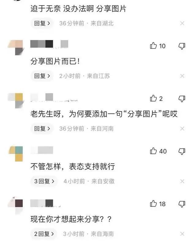 不过还是有很多网友不能接受,主要是他所书写的文案给人一种敷衍的感觉,竟然配文“分享图片”四个大字,这使得他的评论区再度沦陷,立场仍旧遭到大家质疑。