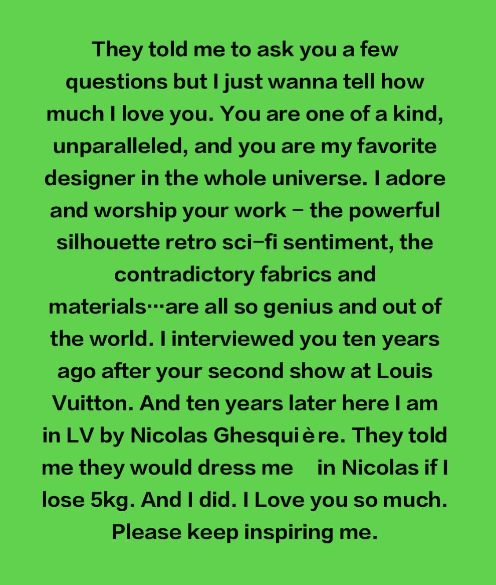 但Nicolas是我最喜欢的设计师,时间也有限,所以我当时大脑充血,肾上腺素飙升,化身Nicki Minaj, 在两分钟内一口气说了段长达100多个词的告白rap: