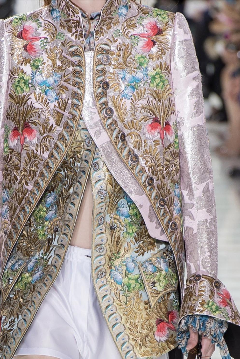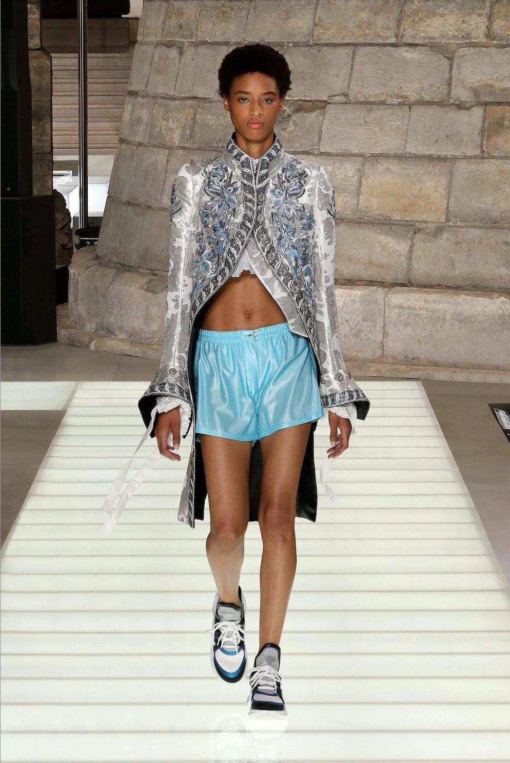 LV 2025春夏女装大秀里,他让模特穿上18世纪的法国贵族服饰,织锦缎长袍上是极致细腻的刺绣,搭配的却是特别当下的拳击亮缎短裤。