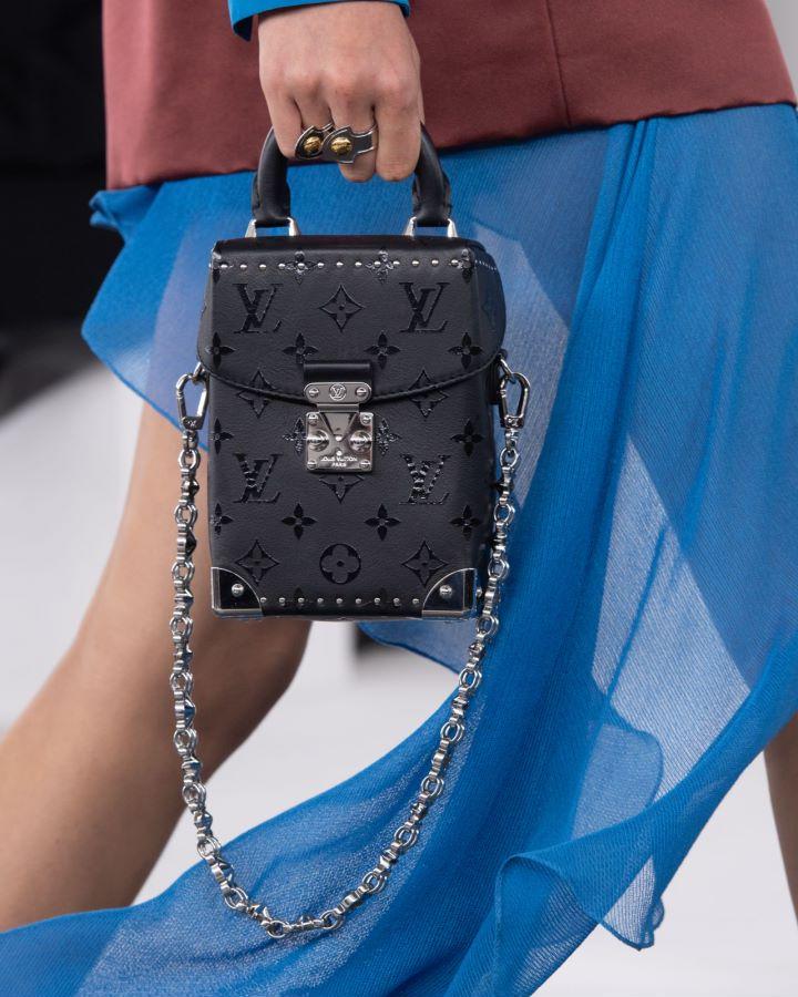 还有这只Camera Box,方正的包型和低调的老花压纹都挺沉稳内敛的,但链条却像精美的冷兵器一样,一下就让整只包变得大胆又年轻。