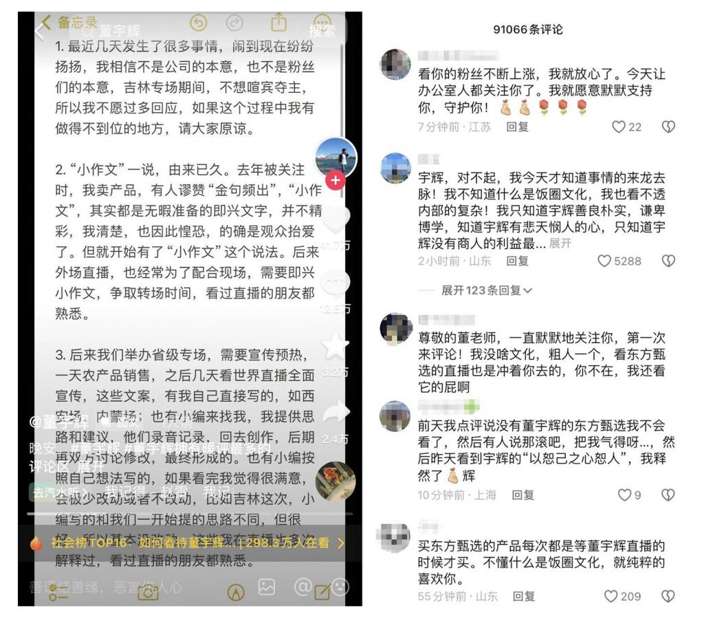 然而,董宇辉自己这么说没事儿,可东方甄选明明经常用 " 董宇辉的小作文 " 引流吸粉啊,这下幕后分工猝然被捅到台前,董宇辉的粉丝坐不住了,觉得这是抢功兼背刺,纷纷为董宇辉鸣不平、讨说法,东方甄选的评论区变成吵架区。