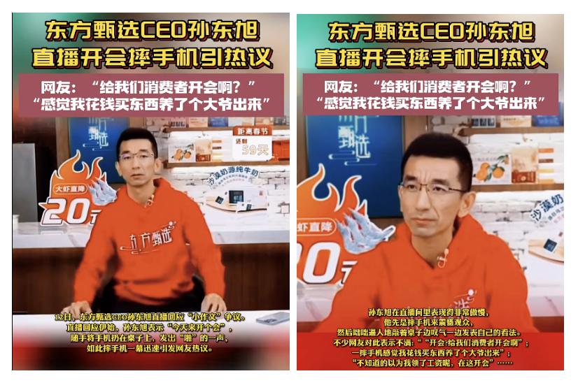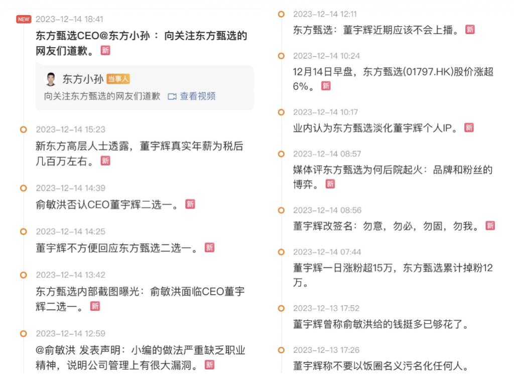 于是集团高层也坐不住了。12 月 8 日、9 日,东方甄选 CEO 孙东旭又是在直播间辟谣,又是发视频澄清,表示文案写作有董宇辉的参与,充分肯定其突出贡献,同时强调公司内部有明确分工," 不建议捧杀和拉踩 "。