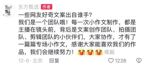 12 月 5 日,东方甄选抖音发布一条文旅宣传视频,内容为当家销冠董宇辉朗诵关于吉林省的小作文,一切都很寻常,直到运营 " 小编 " 次日在评论区爆料:虽然镜头前只有主播在说话,但背后还站着文案创作团队。
