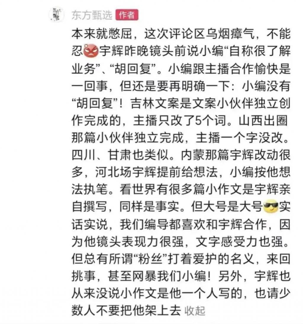 因为事情吵着吵着已经不再关乎" 小作文谁写的 ",而是" 你们东方甄选到底有没有用心对待我们宇辉 "。