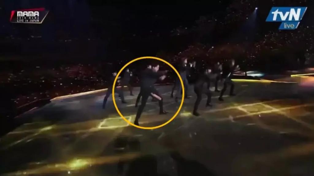 在MAMA的颁奖礼表演时,他的裤子从膝盖裂到了大腿根。