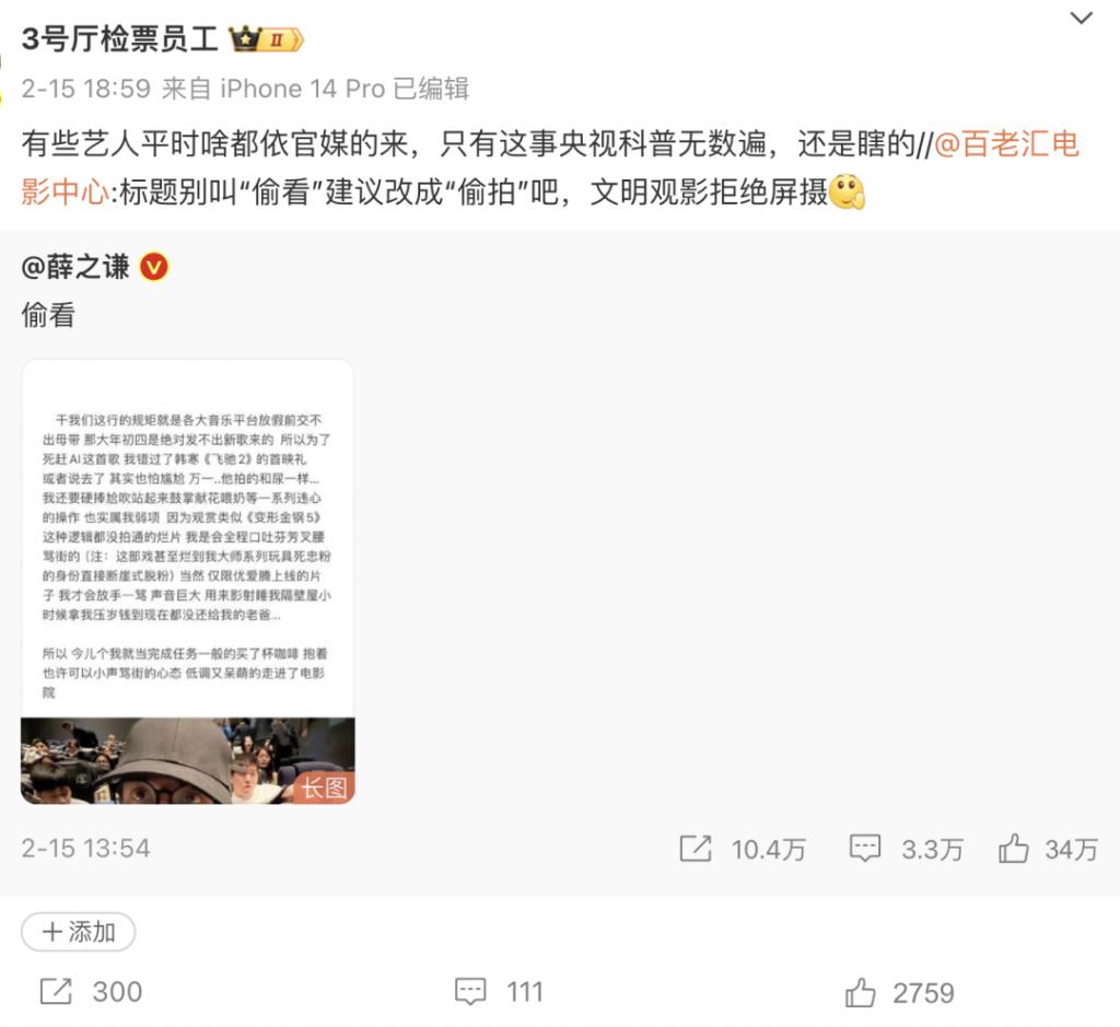 本来也不是一件那么上纲上线、杀人放火的大事,退一万步讲,不说违法、侵权,屏摄至少是不文明观影、影响他人的行为,薛之谦道个歉,顺便呼吁大家不要效仿,就能得到公众谅解、影迷赞扬,还能成为文明观影公益大使,两全其美。