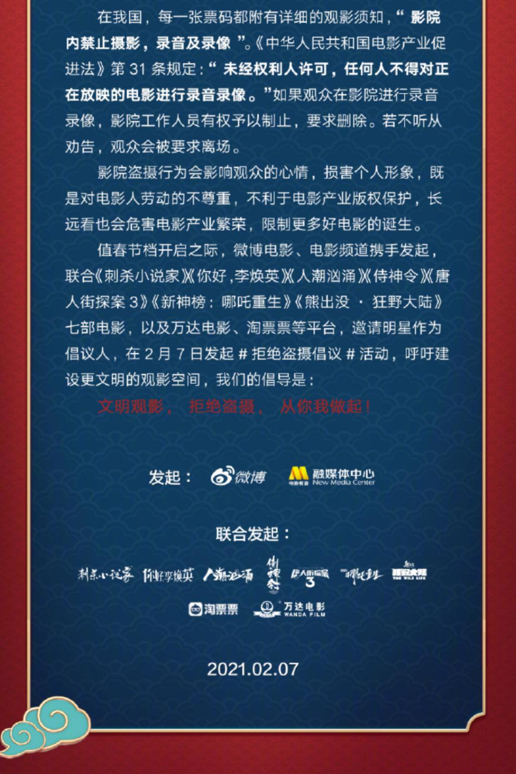 2025年春节档,七部院线大片再次发布"反对盗摄倡议书"。
