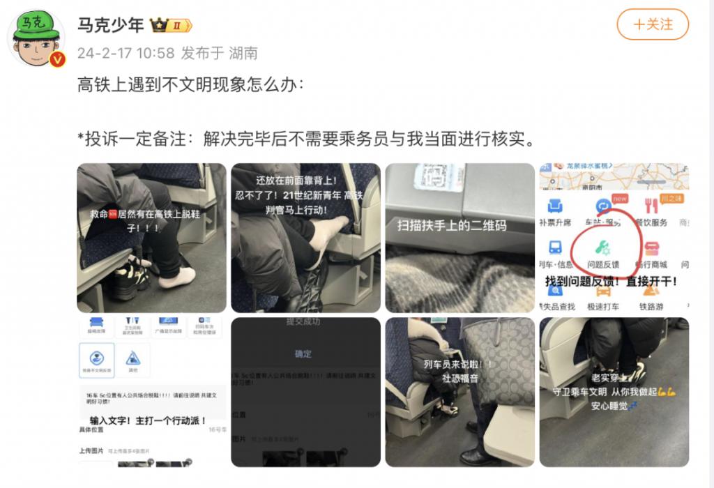 最近她姐也刷到一些正面案例,有网友坐高铁发现有人脱鞋,便在线上系统提交了举报,由高铁的工作人员出面制止。