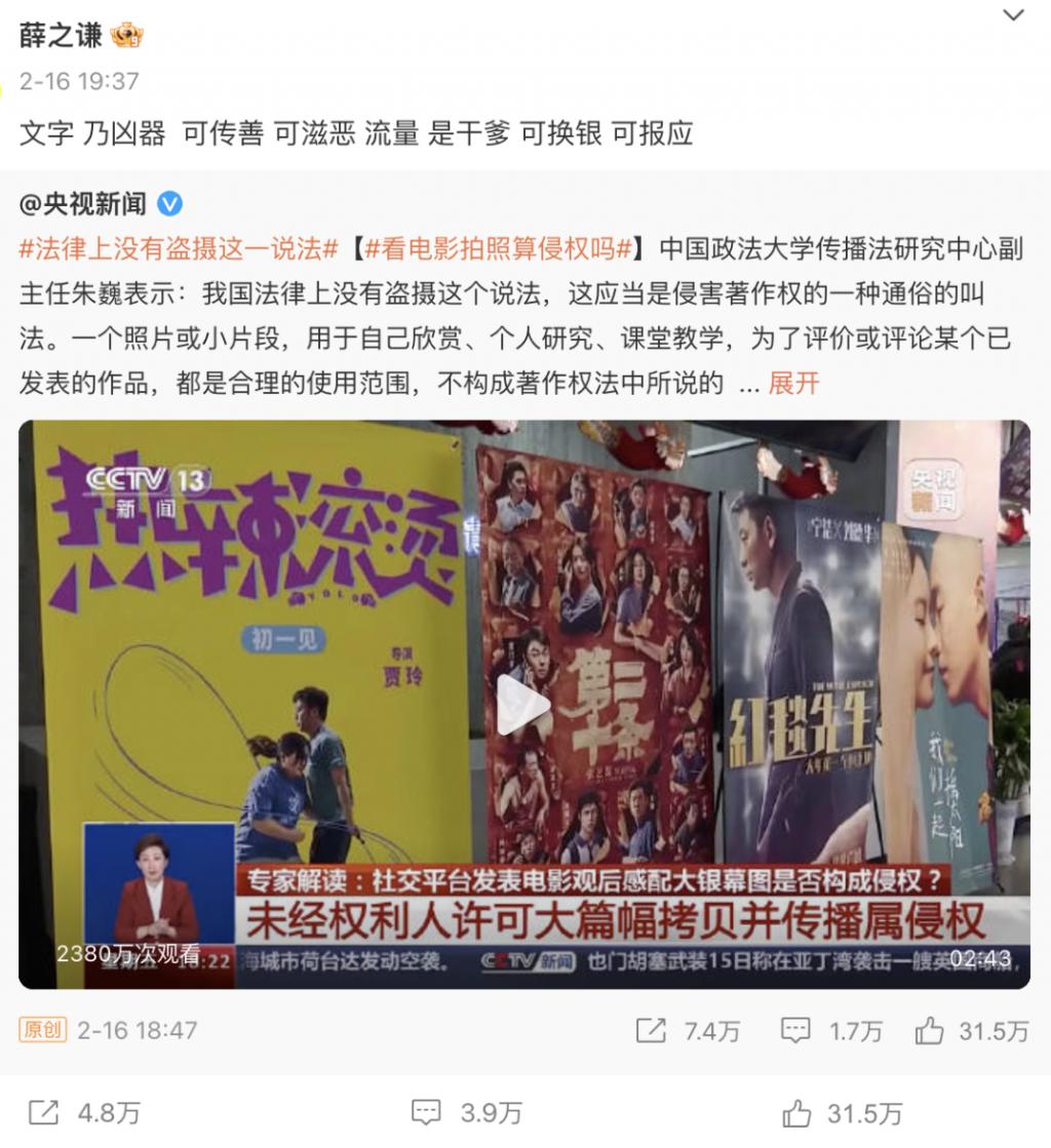 央视电影频道也出来科普"传播屏摄图片属于侵权行为",在这里给六公主点个赞。