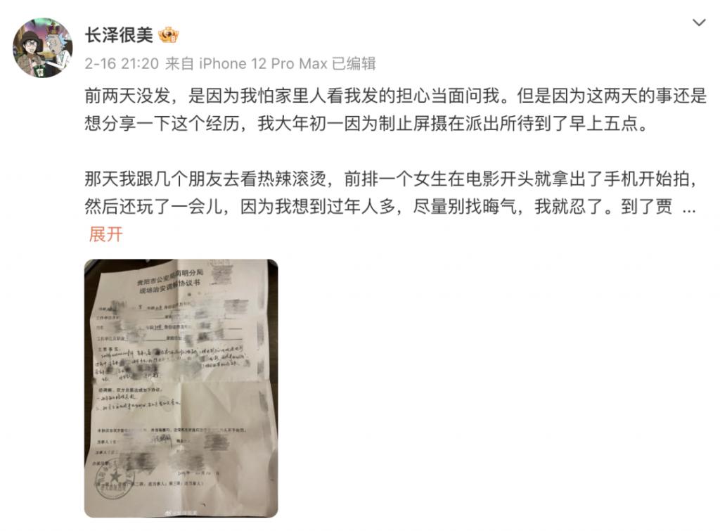 两方矛盾愈演愈烈,博主只得报警处理。到了派出所,更是黑色幽默的开始。负责调解他们的民警也不懂在影院里拍个照怎么了。