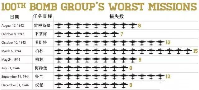 二战期间,第100轰炸机大队损失最惨重的几次任务统计表
