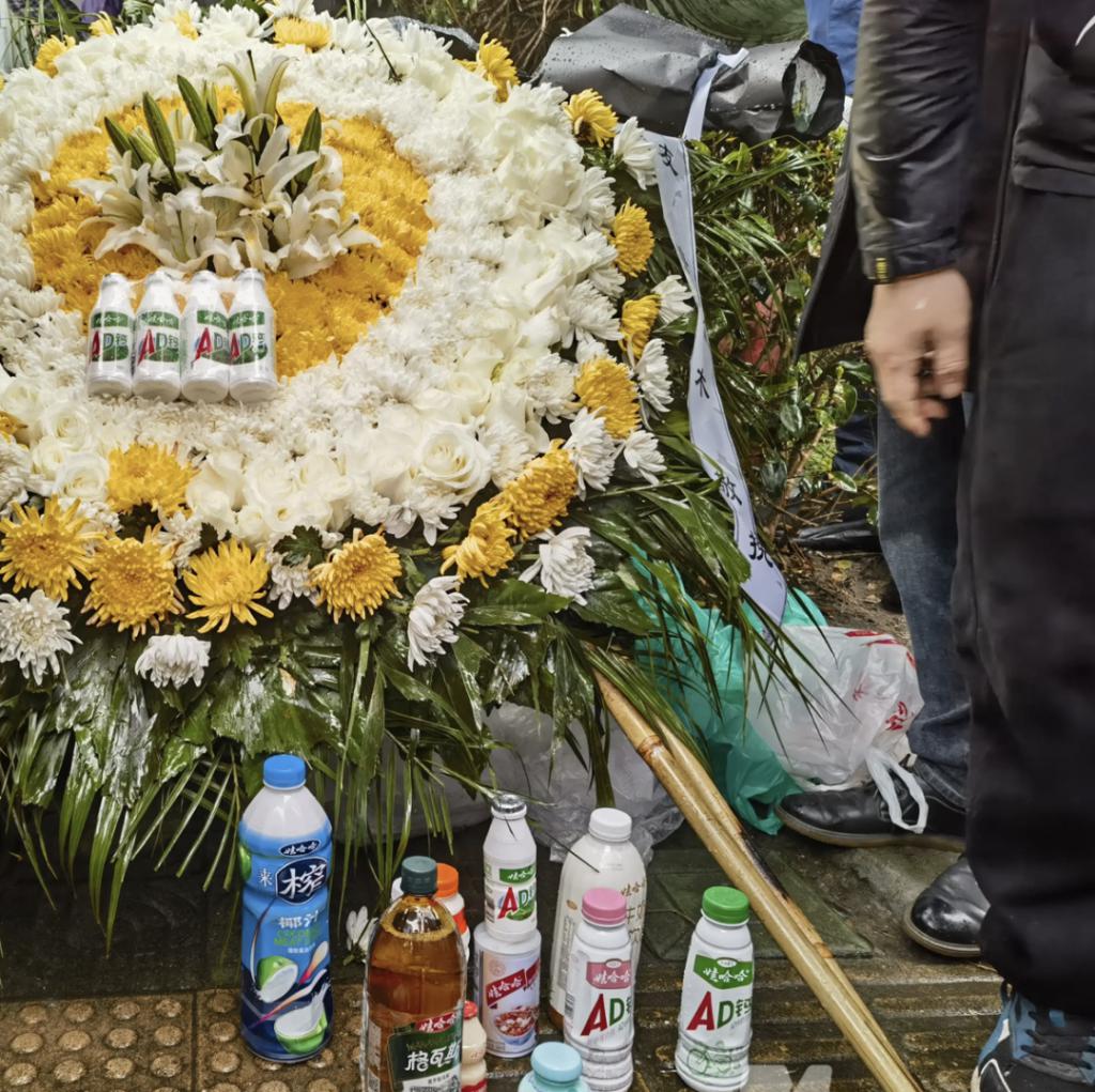 门口摆满了鲜花、AD钙奶与娃哈哈纯净水,天南海北的人冒雨前来,送别这位陪自己长大的老朋友。