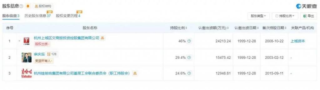 娃哈哈集团的股东由三方构成:杭州上城区投资控股集团有限公司持股46%,宗庆后持股29.4%,娃哈哈集团基层工会联合委员会(职工持股会)持股24.6%。