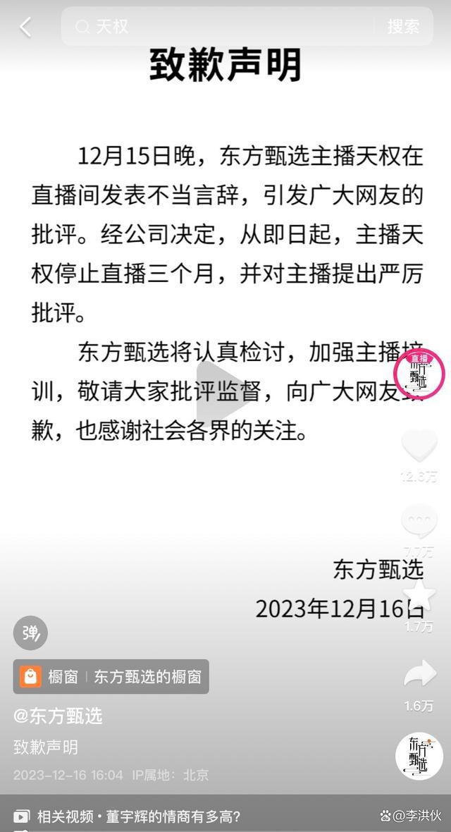 随后,东方甄选又就天权的错误言论发布了道歉声明,称经公司决定,从即日起,主播天权停止直播三个月,并对主播提出严厉批评。