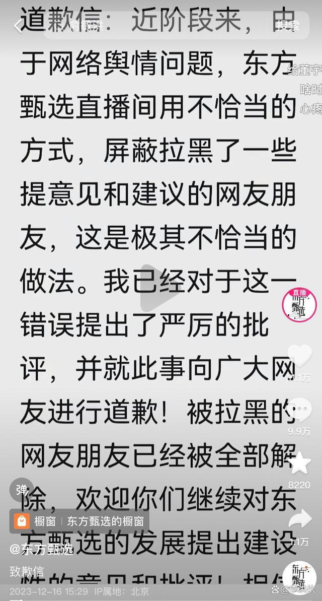 东方甄选董事长俞敏洪也通过东方甄选账号发道歉信: