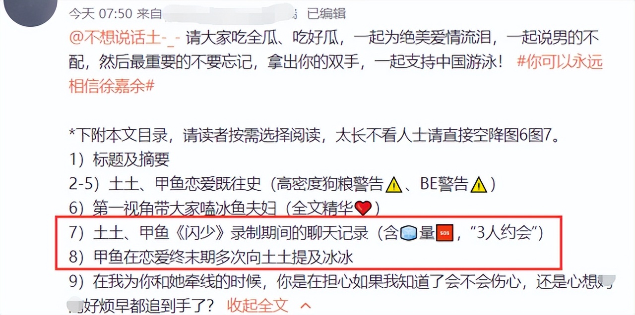 一位自称是徐嘉余前女友的“土土”亲自下场带着小论文和许多证据实锤徐嘉余在与其谈恋爱时劈腿王冰冰,这篇文章也是获得了大量的转发评论和点赞,一时间把王冰冰和徐嘉余推上了风口浪尖。谁能想到本来只是一个甜蜜的恋爱官宣,却引出了如此的轩然大波,王冰冰也因此被扣上了小三的名头。