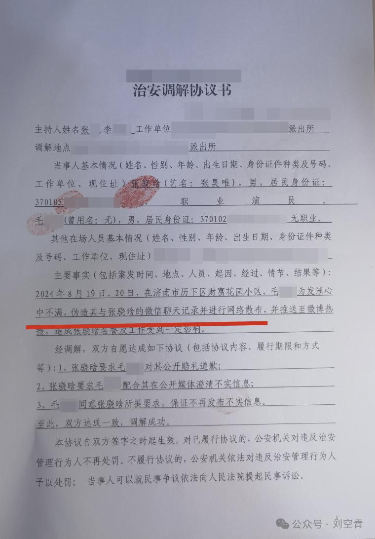 我 毛 xx 身份证 370 用技术手段造假聊天记录发给狗仔,我本想借狗仔的嘴吓唬一下张骁晗,结果狗仔在未经允许的情况下于 2024 年 8 月 19 日发布网络造成了张骁晗名誉受损,经过民警的批评教育,我深刻认识到自己的错误,特手写道歉信,希望获得谅解。