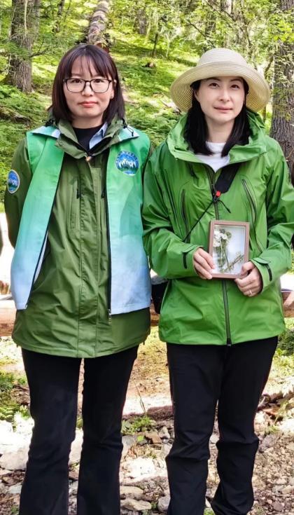 上图是郭晶晶和户外自然科的老师一起合影,郭晶晶手里拿着的是孩子们制作出来的自然探索成果。