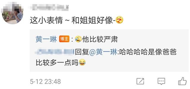 照片中,宝宝脸颊肉嘟嘟的非常可爱,眼睛大鼻子俏,表情酷酷的。有粉丝说宝宝和黄一琳很像,她回复“他比较严肃”,明确了男孩性别。