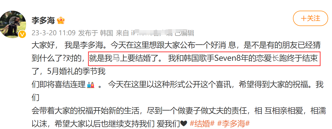 3月20日,曾经的韩国女神李多海毫无预兆地在社交平台上发文,官宣了结婚的喜讯,她与歌手男友结束了8年的爱情长跑,终于步入了婚姻的殿堂,可喜可贺!