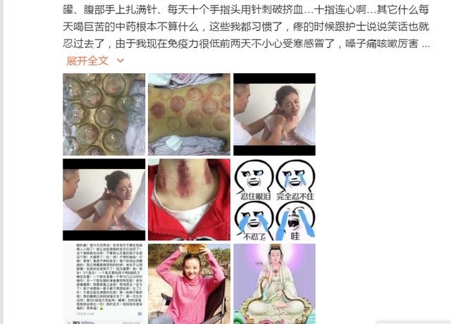 她选择了中医治疗,十指放血、刮痧、背部刺血、拔血罐........过程都是很痛苦的。