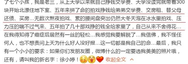 拼命挣钱给弟弟交学费、交房租、替父母还债、买房......五年拍了几十部戏挣的钱全给家里了,自己从来不舍得花…..这个不是现实版的樊胜美吗?