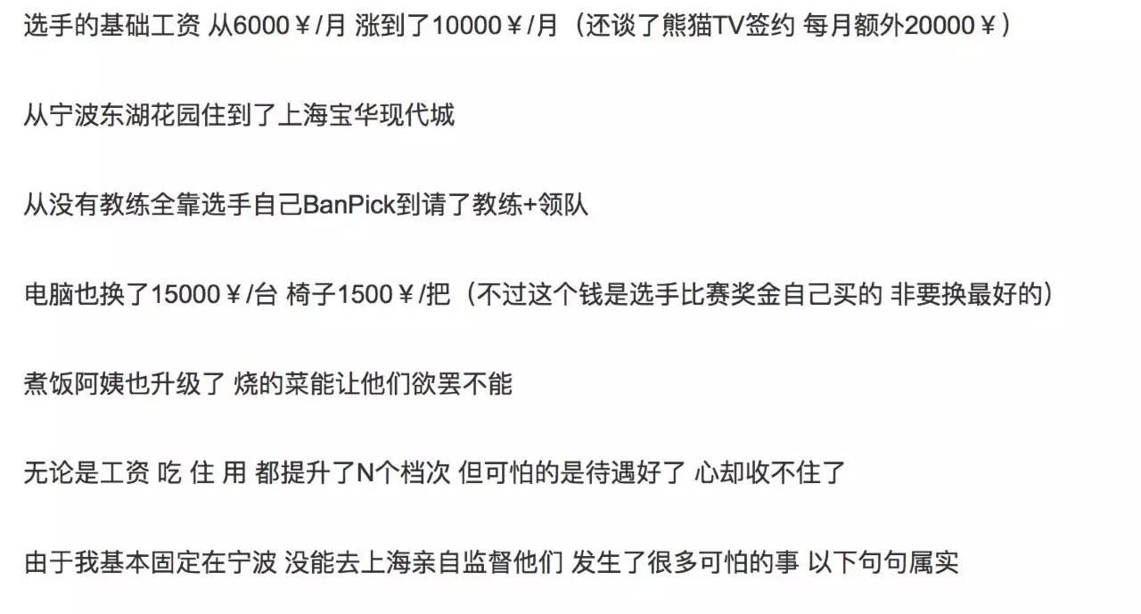 文中指出,自己在能力范围内,给队员创造最好的工作环境:涨工资、改善吃住条件、请教练和领队等,总之各方面都提升了N个档次,但是队员在搬去上海后,心收不住了。