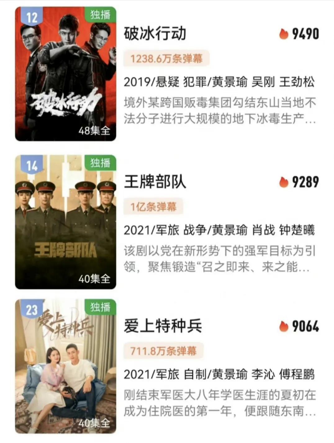 翻看黄景瑜的履历不难发现,他一步步走来稳扎稳打,已经凭借电影红海行动和电视剧破冰行动以及爱上特种兵、王/牌部队和正在热播热度已突破9500的罚罪稳居兵戏一哥的地位。爱奇艺热度榜破9000剧集,黄景瑜一番领衔主演占4部!!!