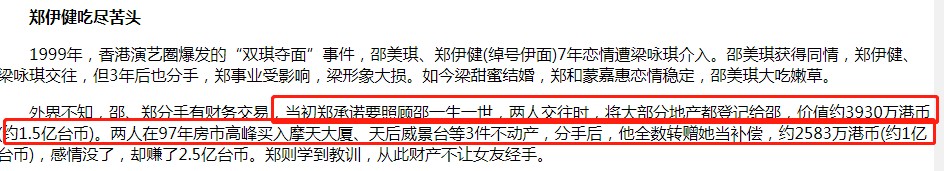 在“双琪夺面”事件之后,众人皆知邵美琪的男人跑了,却不知,郑伊健留了至少过亿的房产给邵美琪。