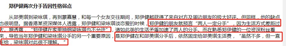 第二个版本是,梁咏琪和郑伊健生活差距太大,郑伊健在家抽烟梁咏琪都忍受不了。