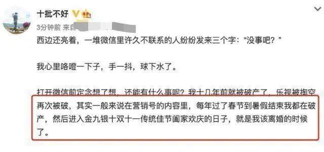 打开微信前定念想了想,还能有什么事呢?我十几年前就被破产了,乐视被掏空再次被破,其实一般来说在营销号的内容里,每年过了春节到暑假结束我都在破产,然后进入金九银十双十一传统佳节阖家欢庆的日子,就是我该离婚的时候了。