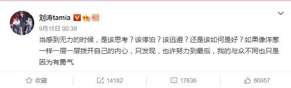9月15日凌晨,演员刘涛发了一条微博感叹: