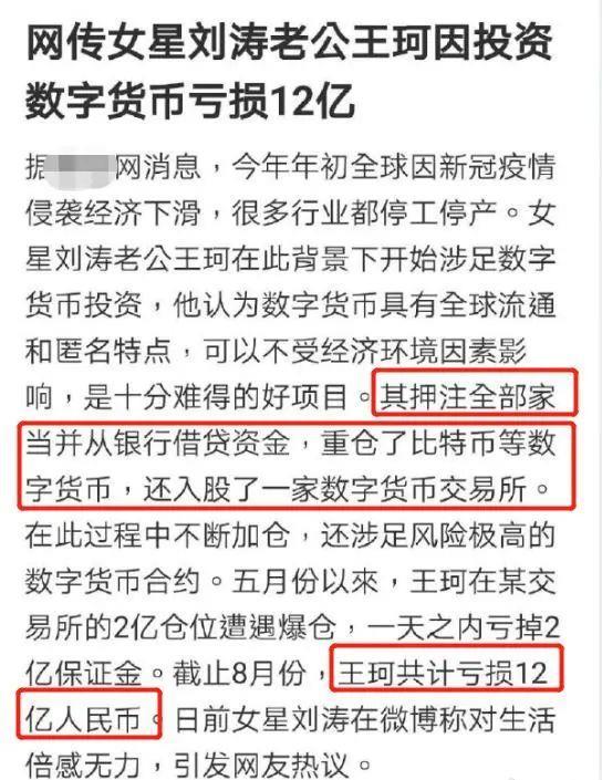 小编注意到,该话题中有不少自媒体关于刘涛的文章,包括“媒体曝刘涛老公王珂因投资比特币,半年亏了12亿”,“王珂被传投资再败,刘涛深夜发文心态全崩,为老公还债数亿太累?”等。