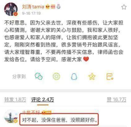 不好意思,因为父亲去世,深夜有些感伤,让大家担心和猜测,谢谢大家的关心与鼓励,我和家人很好,也感谢爱人和家人的陪伴,让我们拥抱彼此更加坚定,刚刚突然看到热搜,很多营销号开始跟风谣言,请大家理智尊重,不要再传播不实信息,律师函也会发给各位,请给予空间,感谢大家。