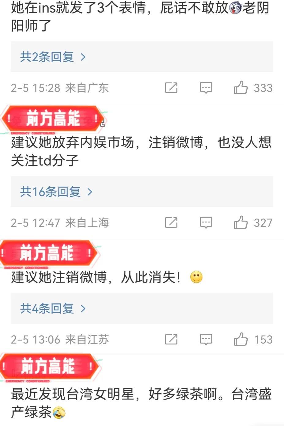 总之她这次算是彻底把在大陆的路人缘给败光了,也得亏她回台湾发展了,如果她还在内地发展的话,这次算是事业人设全面塌房了。