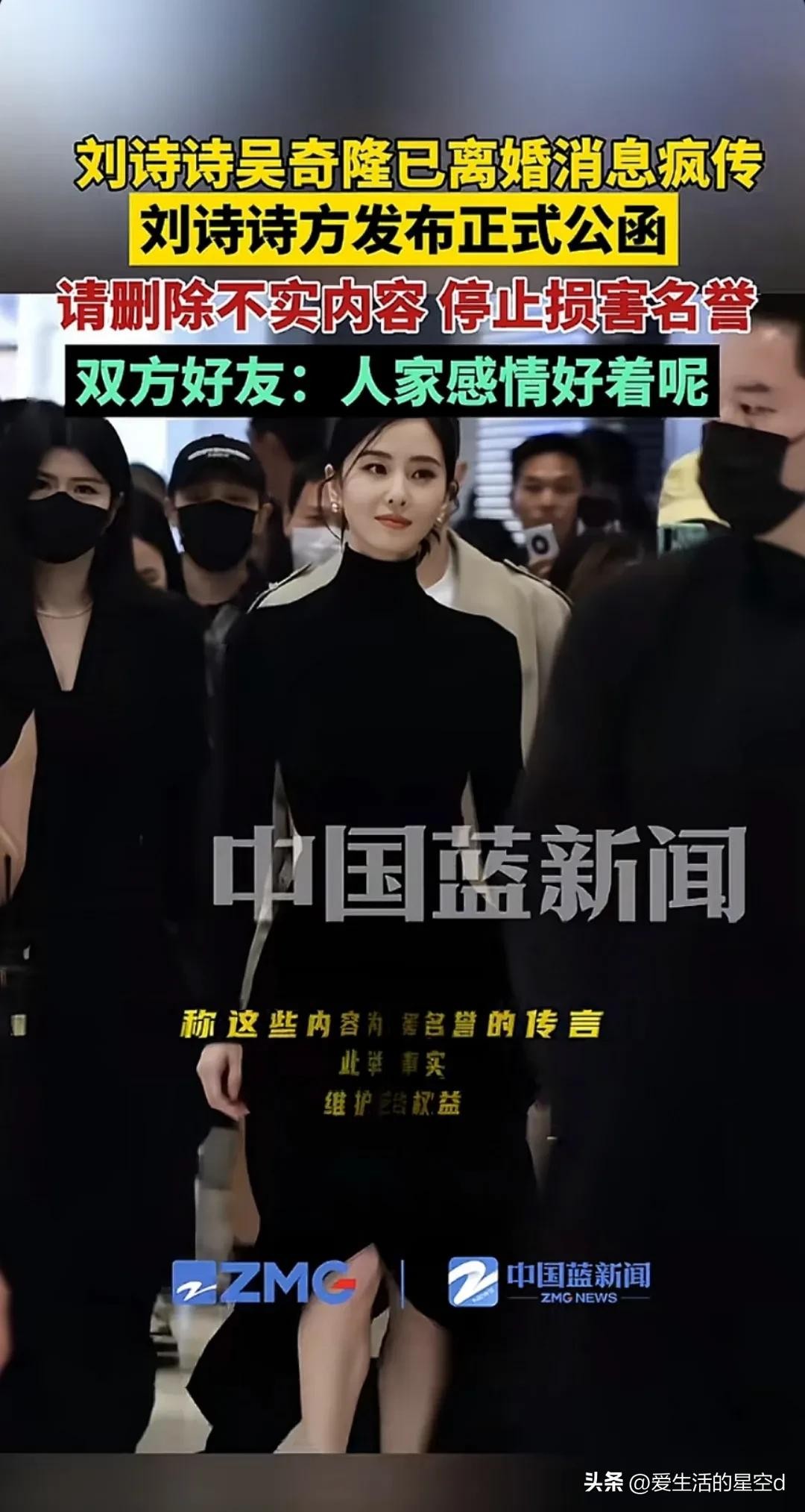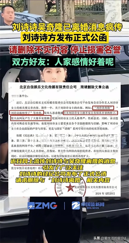 刘诗诗辟谣离婚!公司发函称网传离婚消息不实,为吴奇隆出头