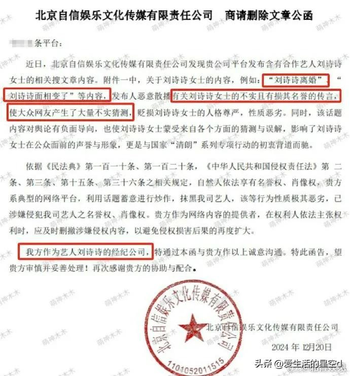先说刘诗诗这边的动作,眼瞅着离婚传闻愈演愈烈,刘诗诗直接委托经纪公司强势发函辟谣。这一纸声明,目标明确,不仅要击碎“离婚”这个大雷,还把“面相变了”这类莫名其妙的传言也一并打包处理。可没想到,这波操作却有点“用力过猛”,连一些为刘诗诗仗义执言的博主都被投诉,瞬间引发一片哗然。