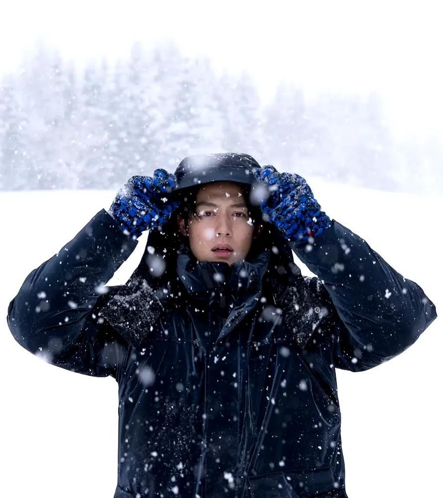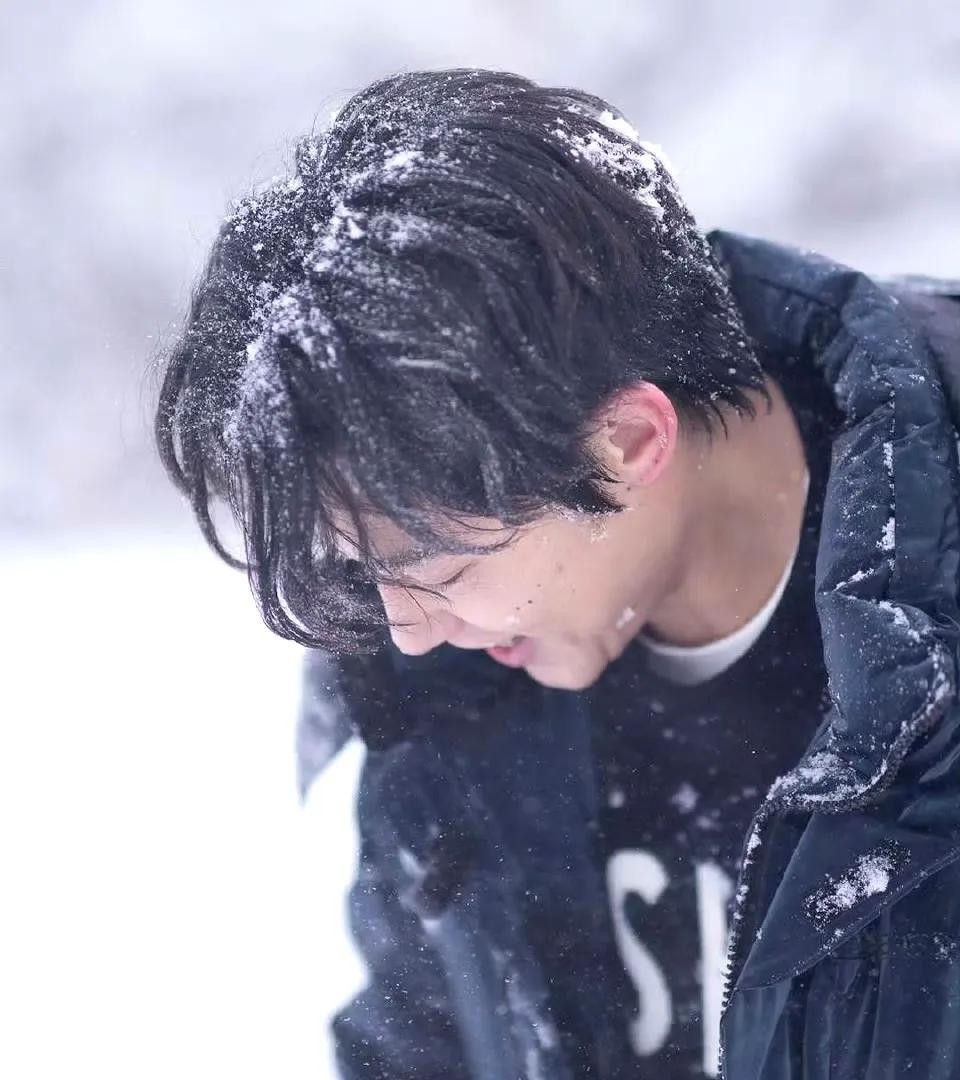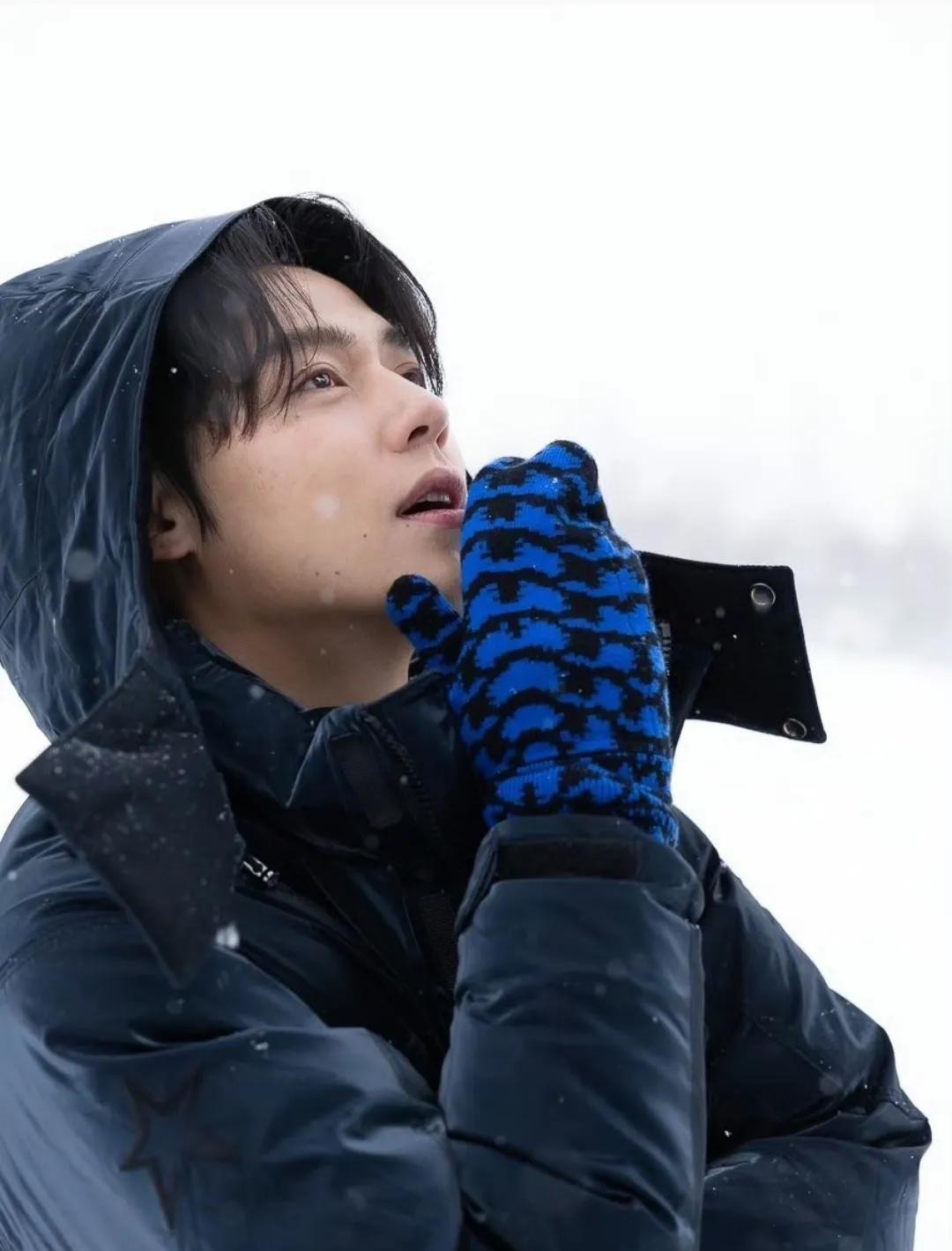照片里的他穿着黑色厚羽绒服,搭配黑色裤子和蓝色针织手套。