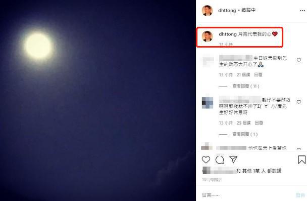 后来有网友曝出,这位神秘男子,是上海的一名富二代,当网络上关于唐鹤德的新恋情传得沸沸扬扬的时候,唐鹤德没有做出过多回应,只是发了一张明月的照片,并配上文案:月亮代表我的心。
