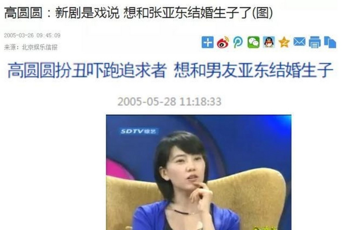 2005 年,徐静蕾和张亚东在拍摄《我和爸爸》时因戏深情,插足了张亚东和高圆圆的这段恋情,高圆圆当时爱的深沉,在各种采访中都毫不避讳的说要结婚生子,分手后也直言:“分手了,因为第三者插足。”