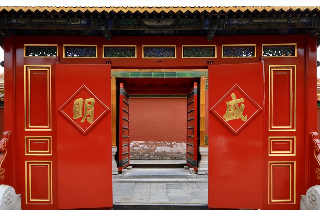门口有座木屏门,上书殿前设“光明盛昌”。但仔细看【明】字和【盛】字为错字,有学者认为书写牌匾的主角是雍正皇帝。雍正皇帝故意将“光明昌盛”四字写错,其实是在诠释人世间并没有完美之人,更没有任何完美之事,暗中契合了不完美就是最大的完美的朴素思想。