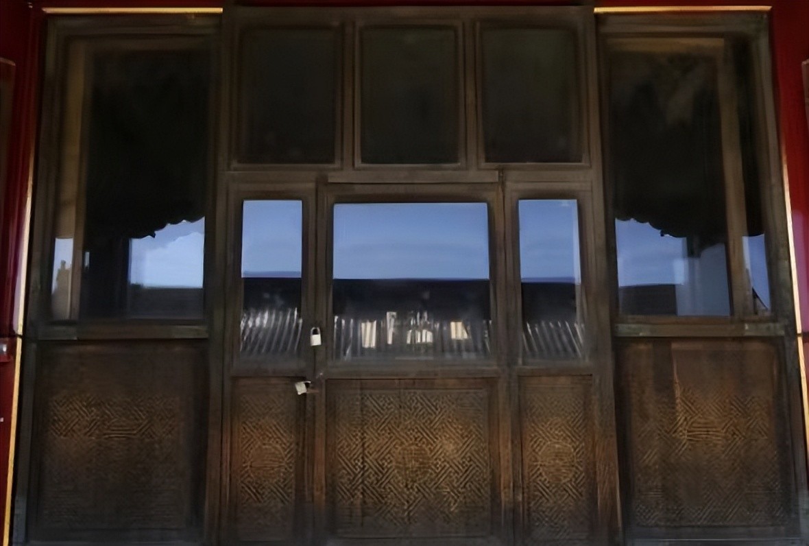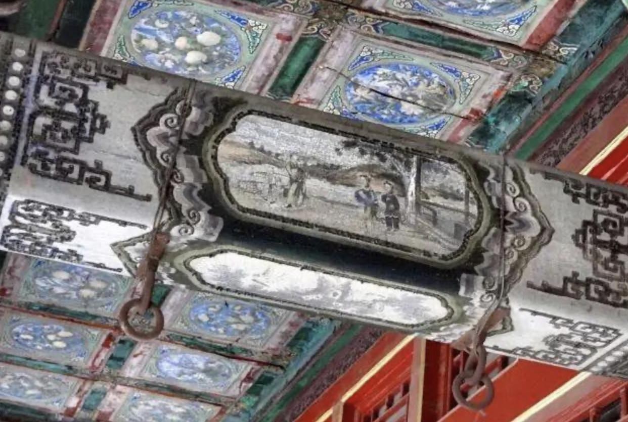正殿前廊横梁上可看到两组吊环,吊环上曾经拴着两组秋千,秋千的主人应该是末代皇后婉容。溥仪大婚后皇后婉容就住在这里。