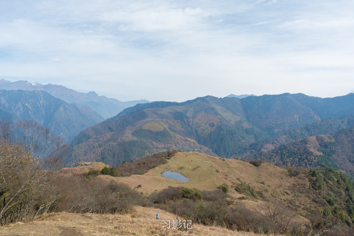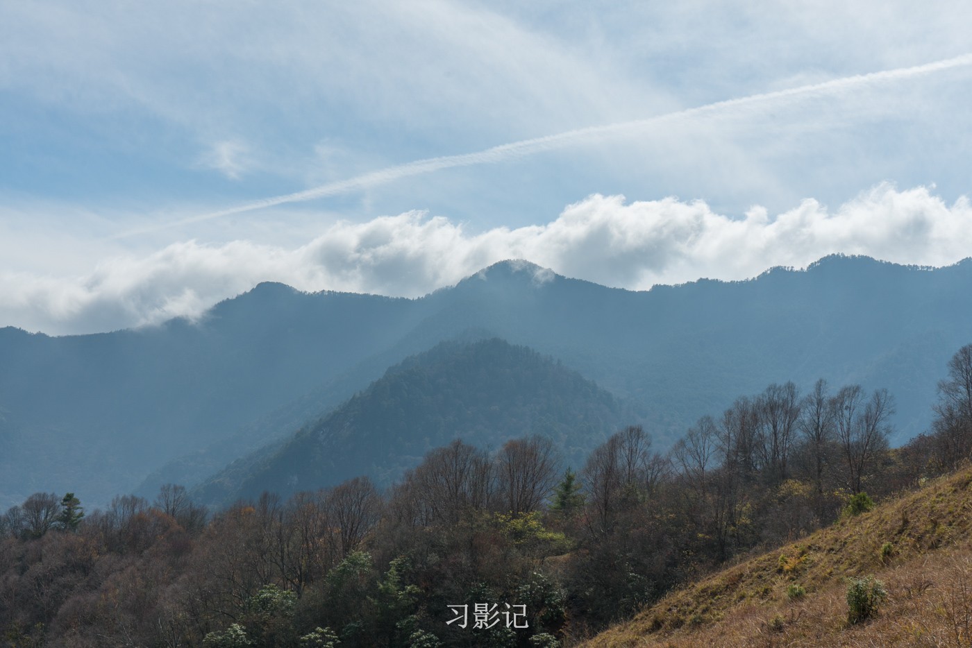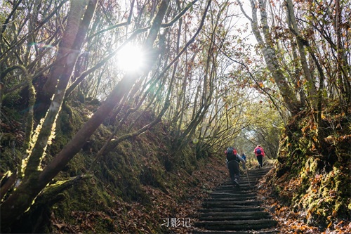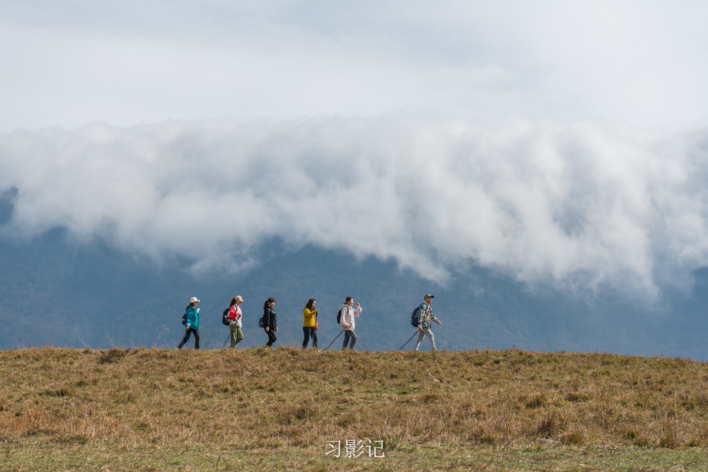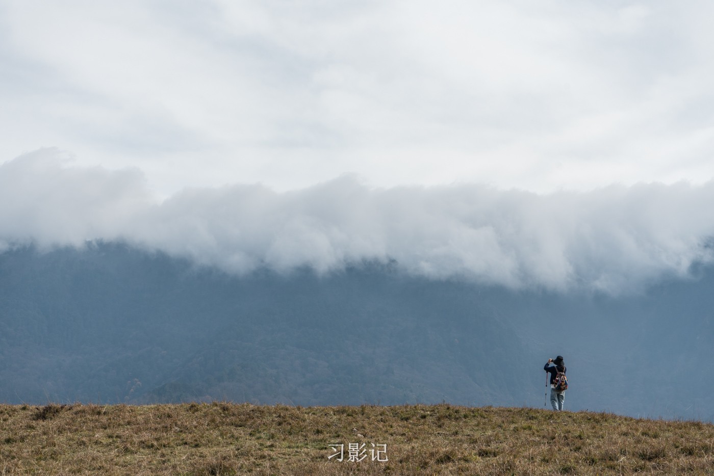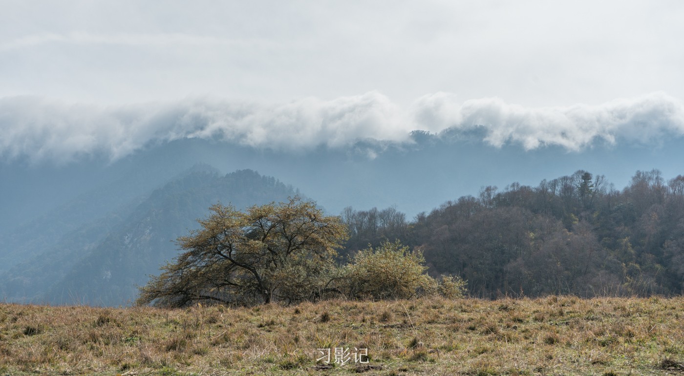高原天气变幻万千,转眼间,对面的山顶就形成了一层云瀑,从来不带三脚架的我,放弃了拍摄视频,但在脑海中想象了云瀑奔涌的模样,后来在徒步群里看到果然有人拍到了。