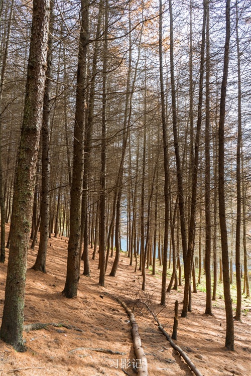 事实上,有不少松针都已掉落,在地上铺了厚厚的一层,踩上去十分柔软舒服。