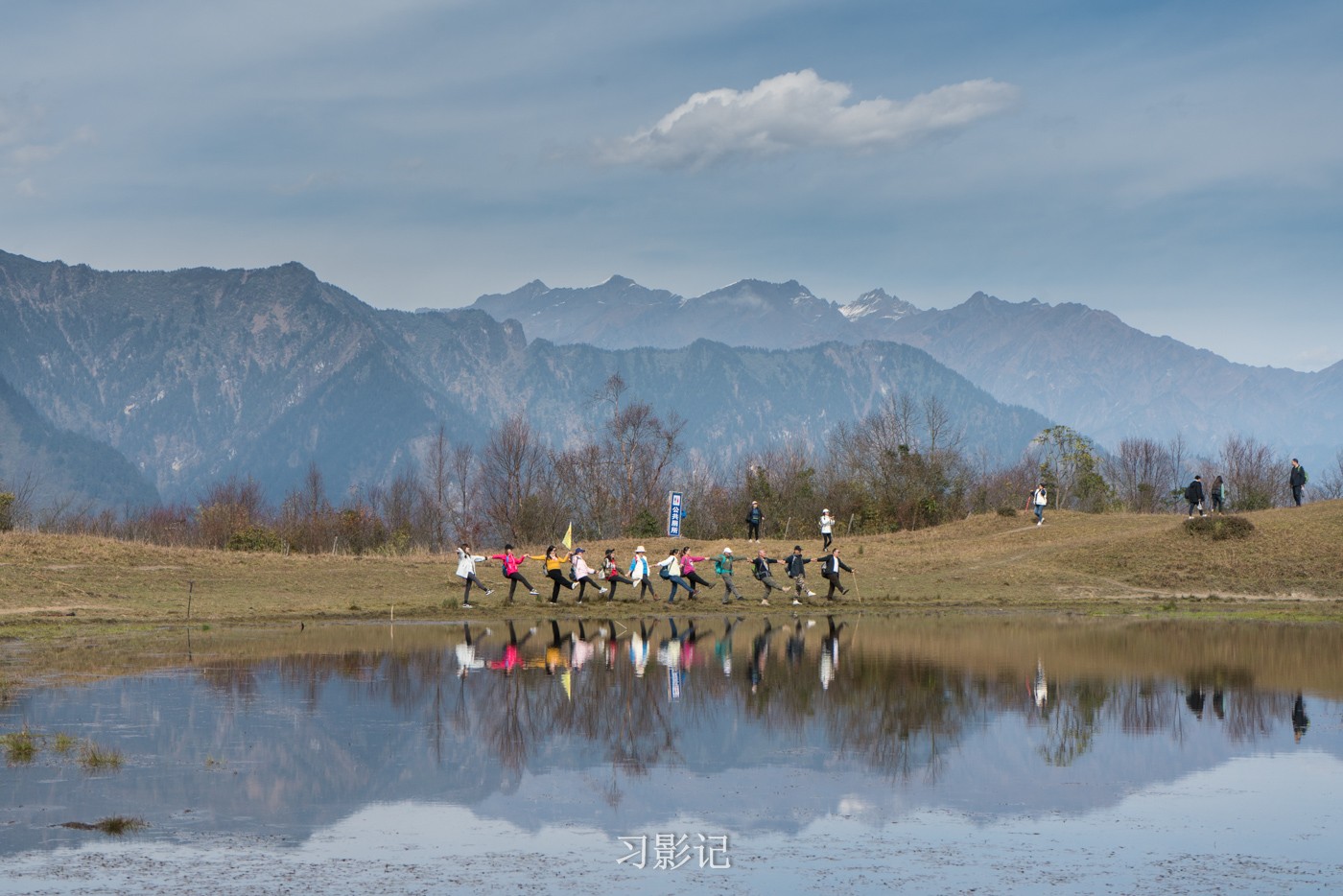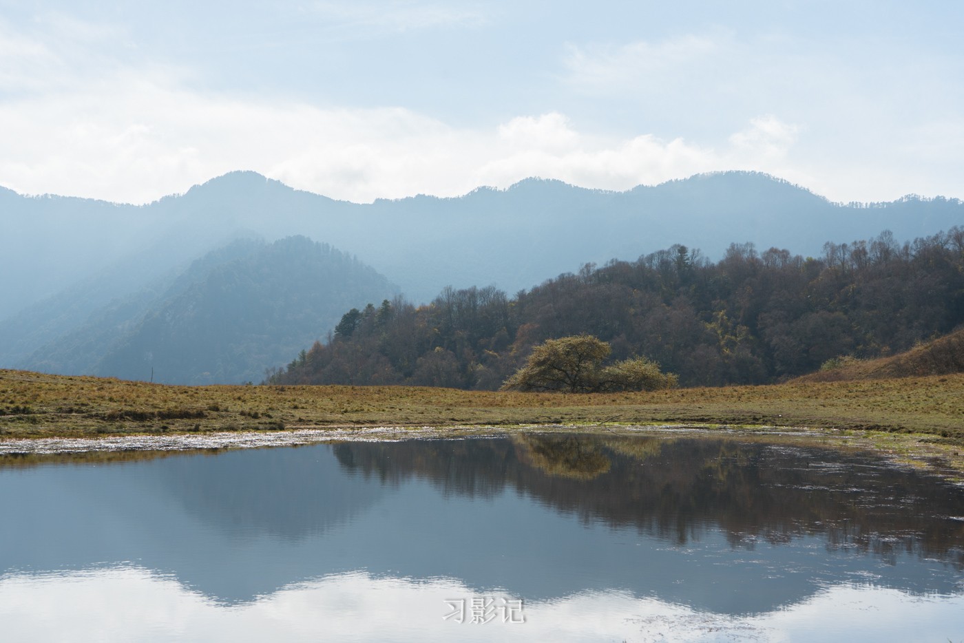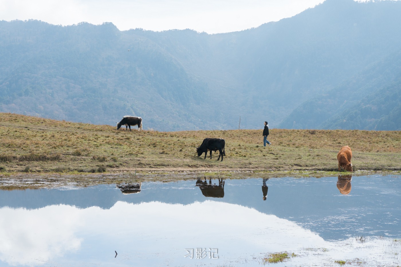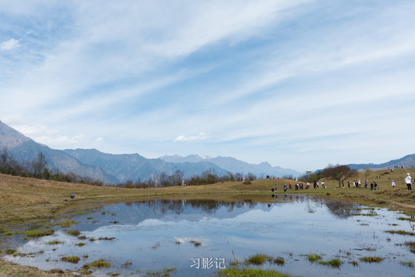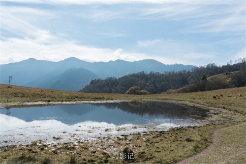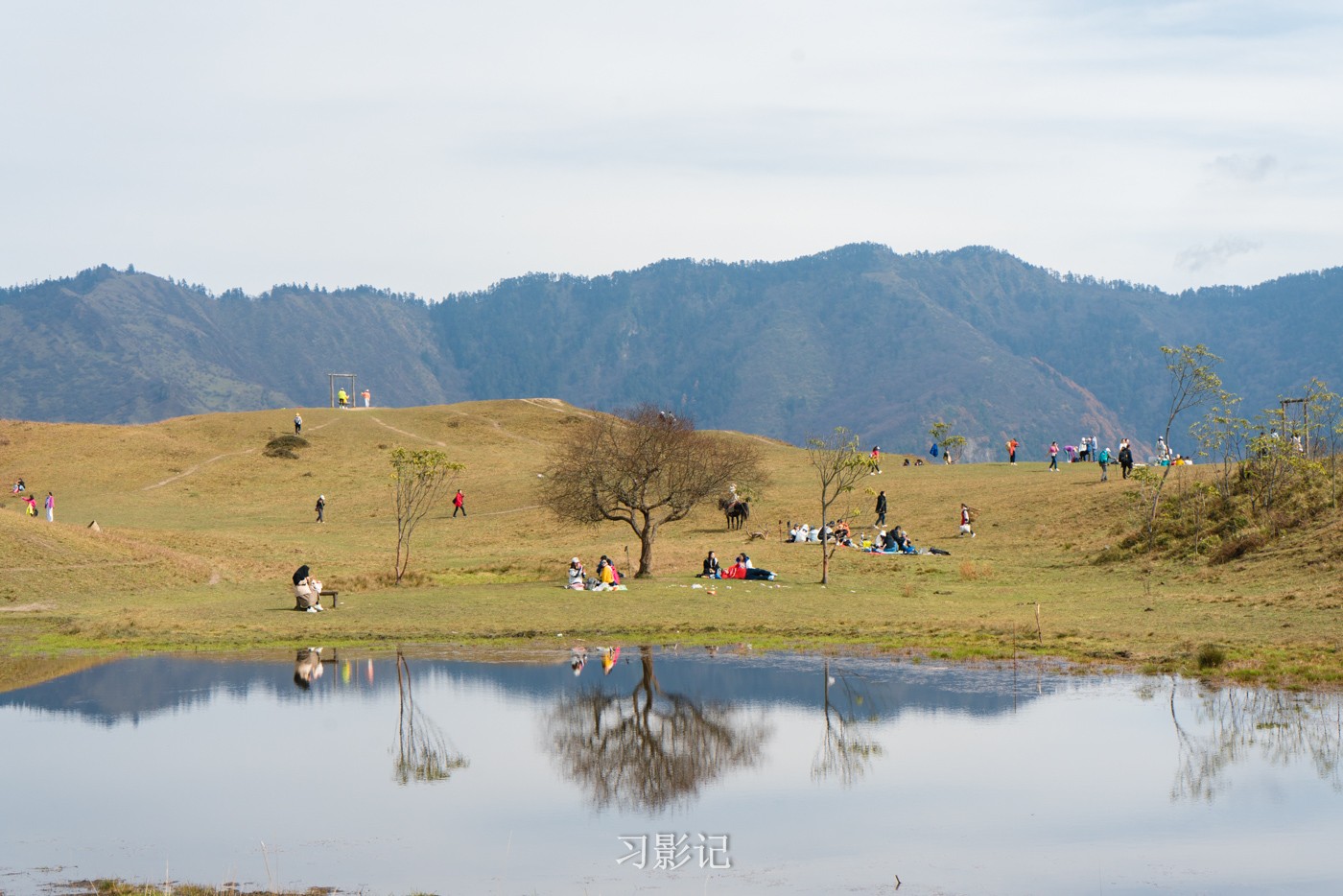 甘海子很小,就像一个小池塘,但有了它,风景就有了另一番滋味,远山,人,树倒映在水中。