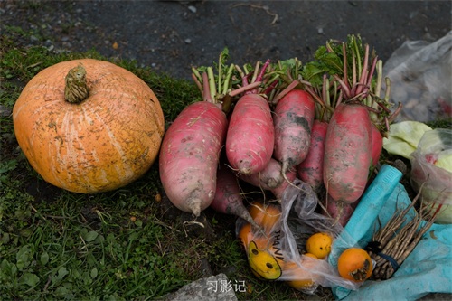 路边有当地村民在卖农产品。好多徒友左手萝卜,右手大白菜。他们说,打了霜的白菜和萝卜特别好吃。