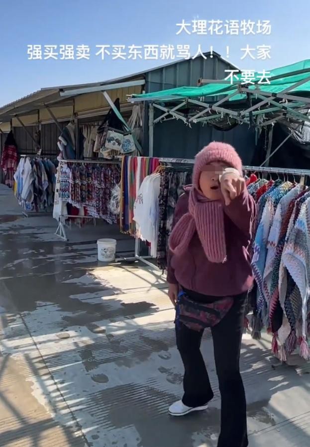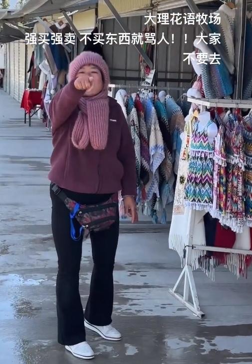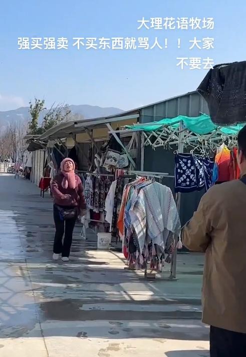 当天,任女士在大理花语牧场玩儿,景区外有一排商业街,主要售卖一些民族服饰和文玩纪念品。
