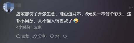 “店家都说了开张生意,能否退两串,5元买一串讨个彩头,这都不同意,太不懂人情世故了。”