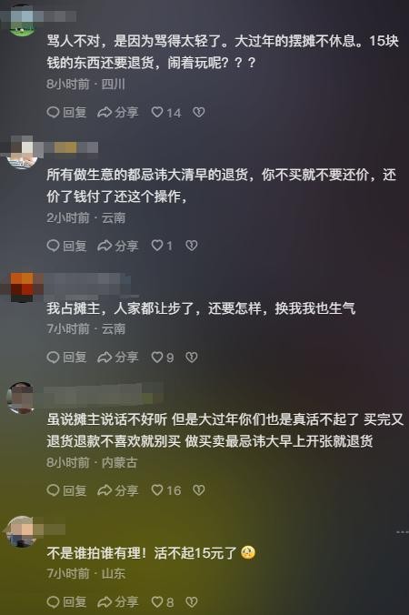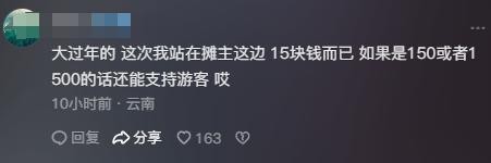 “大过年的,这次我站在摊主这边,15块钱而已,如果是150或者1500的话还能支持游客。”